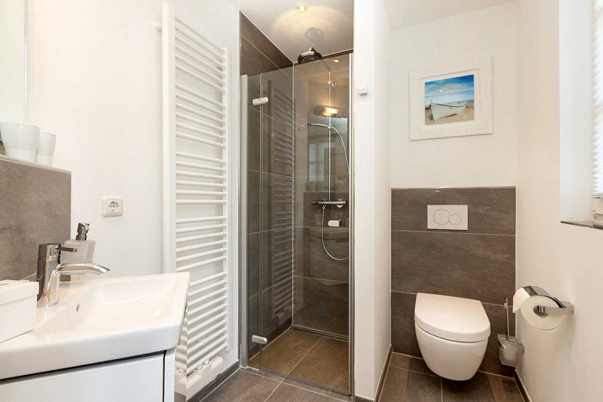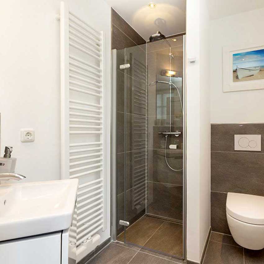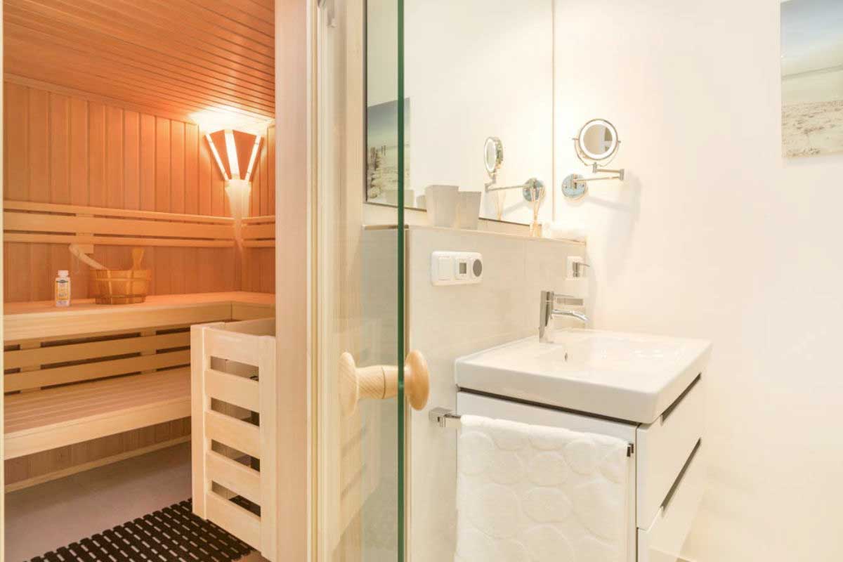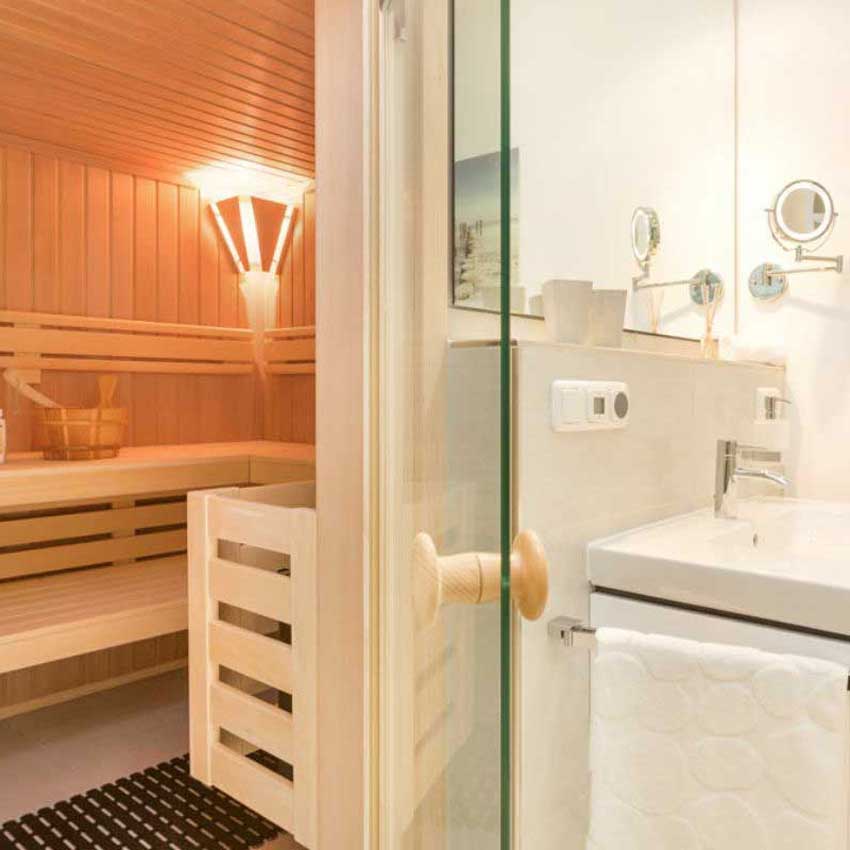 Die hochwertig ausgestattete Sauna befindet sich im Badezimmer im Obergeschoss und bietet ausreichend Platz für zwei bis drei Personen. Durch die integrierte Regendusche direkt nebenan wird aus der Saunazeit ein echtes Wellness-Erlebnis.