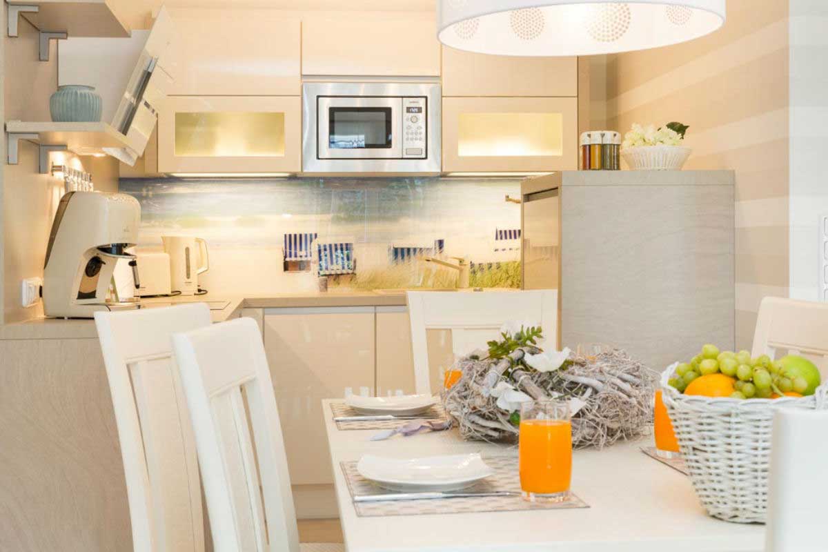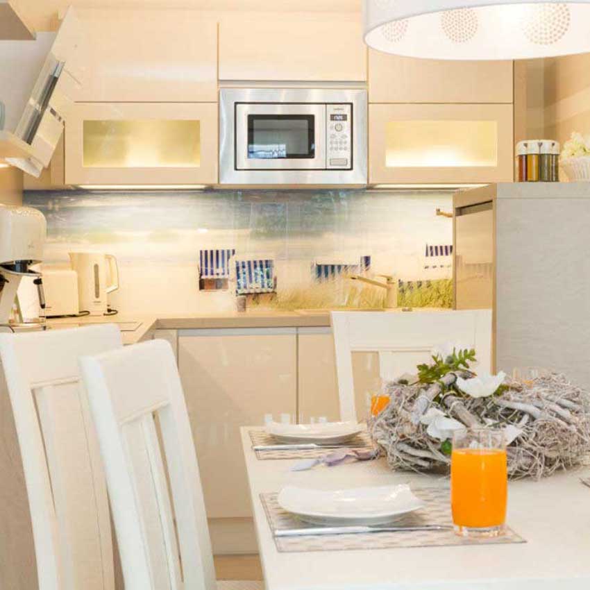 - Voll ausgestattete Küche, u. a. mit Geschirrspüler, Backofen, Mikrowelle, Kaffeeautomat, Wasserkocher, Toaster etc.