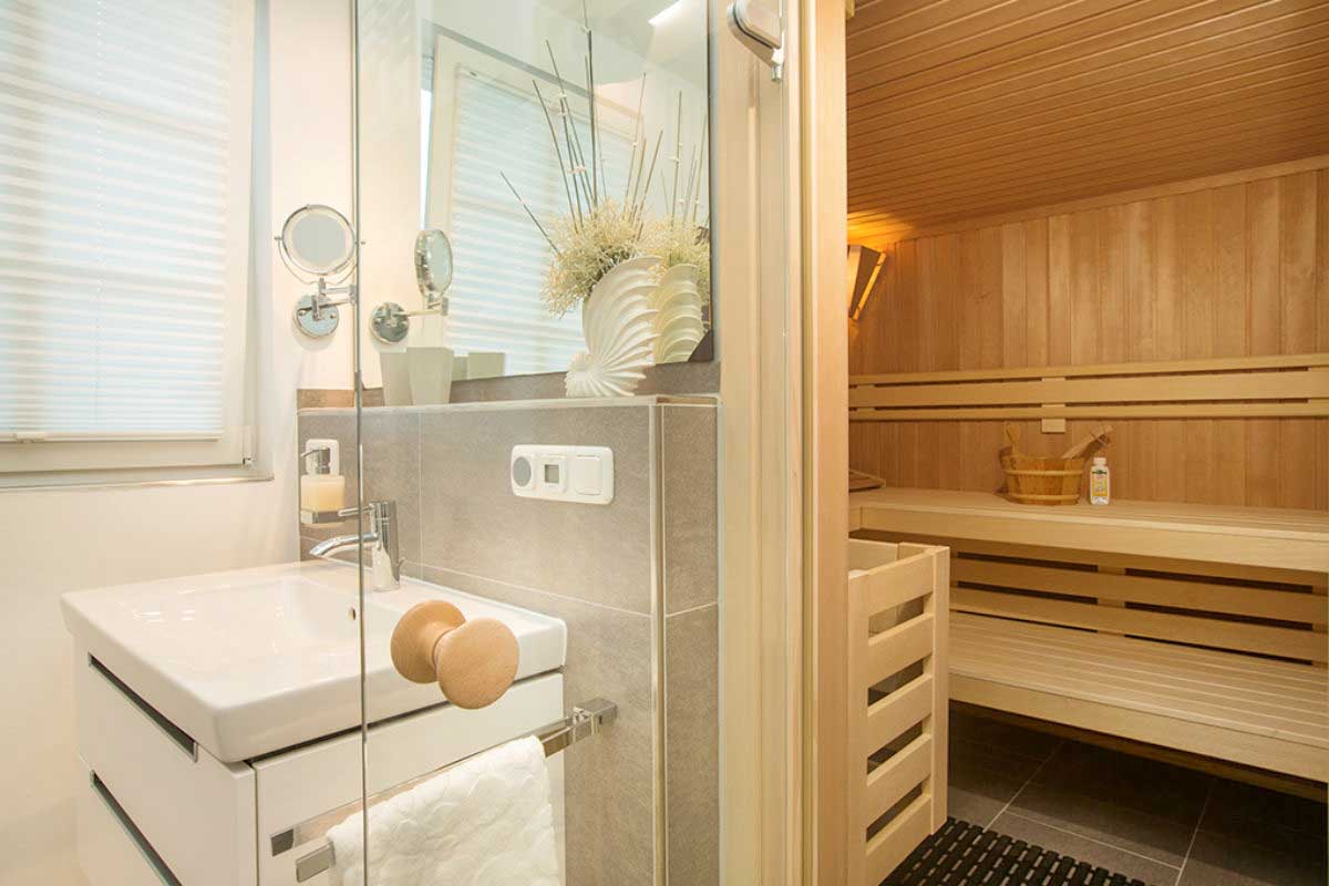 Die hochwertig ausgestattete Sauna befindet sich im Badezimmer im Obergeschoss und bietet ausreichend Platz für zwei bis drei Personen. Durch die integrierte Regendusche direkt nebenan wird aus der Saunazeit ein echtes Wellness-Erlebnis.