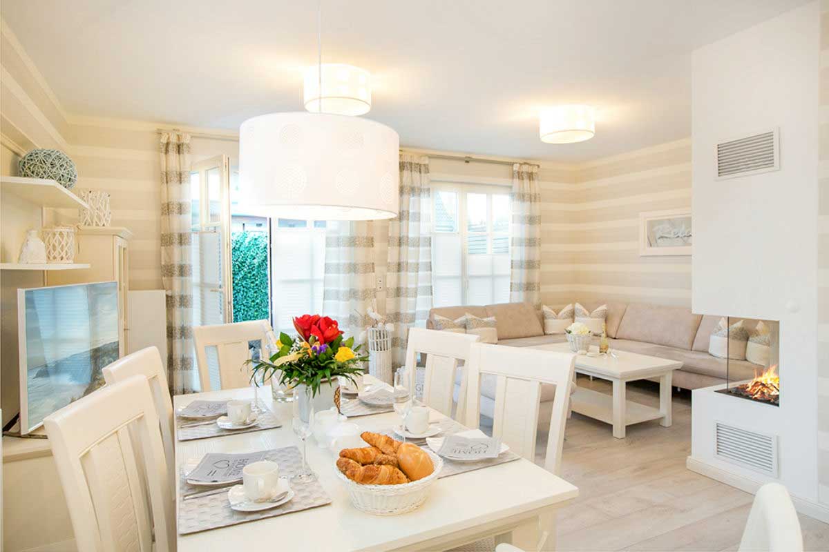 Urlaub mit Wohlfühlgarantie – das bietet Ihnen unser charmantes Haus Zingster Perle 03 im Herzen von Zingst. Das Erdgeschoss begeistert mit einem offen gestalteten Wohn- und Essbereich, ausgestattet mit einer bequemen Sofalandschaft, einem wärmenden Kamin und einer modernen Küche mit allem Komfort. Große Terrassenfenster sorgen für lichtdurchflutete Räume und schaffen eine herrliche Verbindung zum Garten. Ein stilvolles Bad mit ebenerdiger Dusche sowie ein Hauswirtschaftsraum machen das Erdgeschoss komplett.