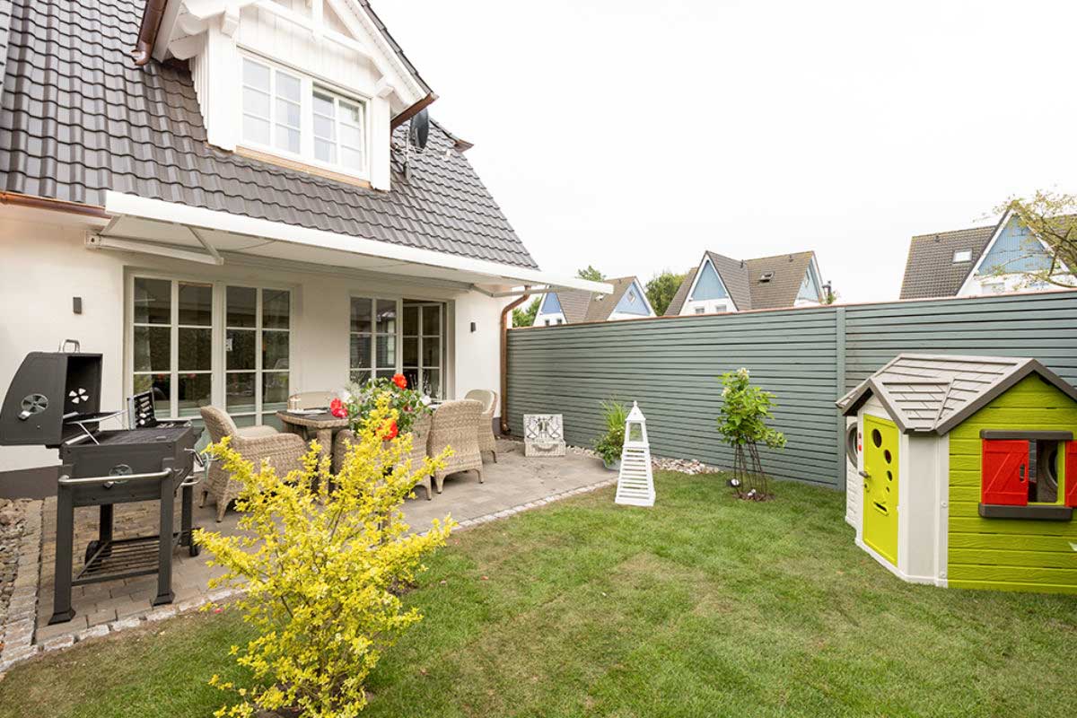 Der eingezäunte Garten mit Terrasse, Markise, Grill und Kinderspielhaus macht das Haus auch für Familien besonders attraktiv. Kinderbett und Hochstuhl stellen wir gern kostenlos zur Verfügung.