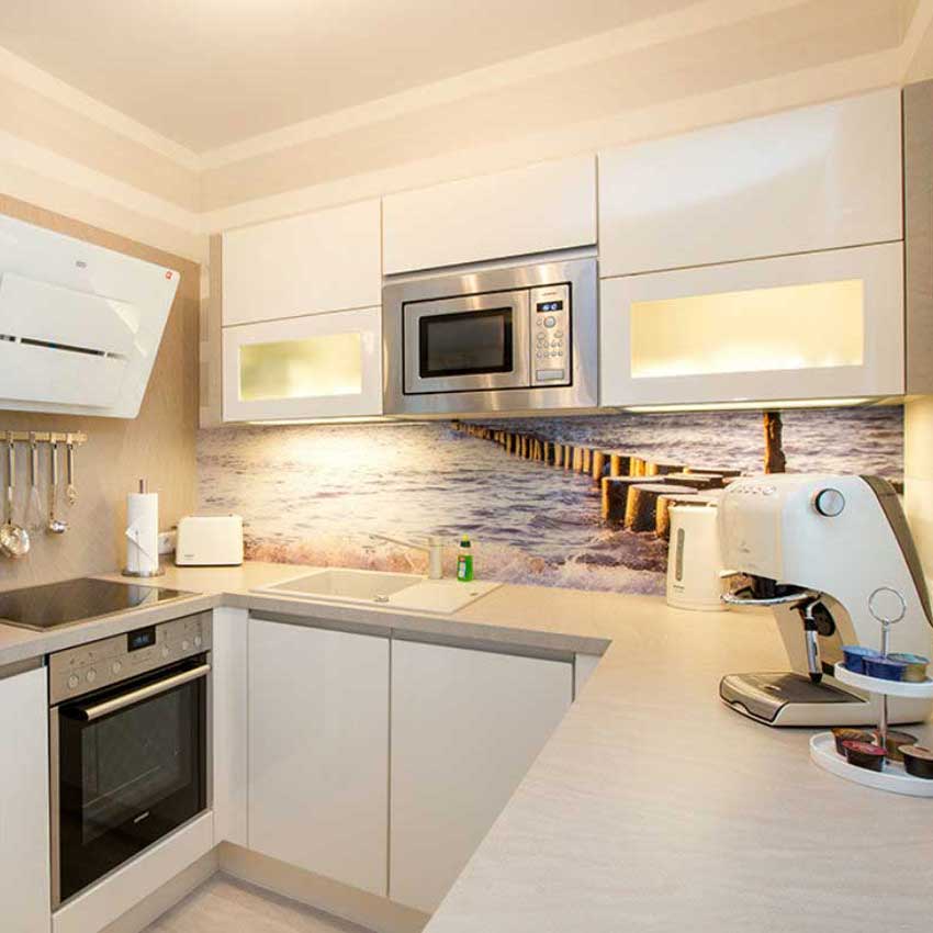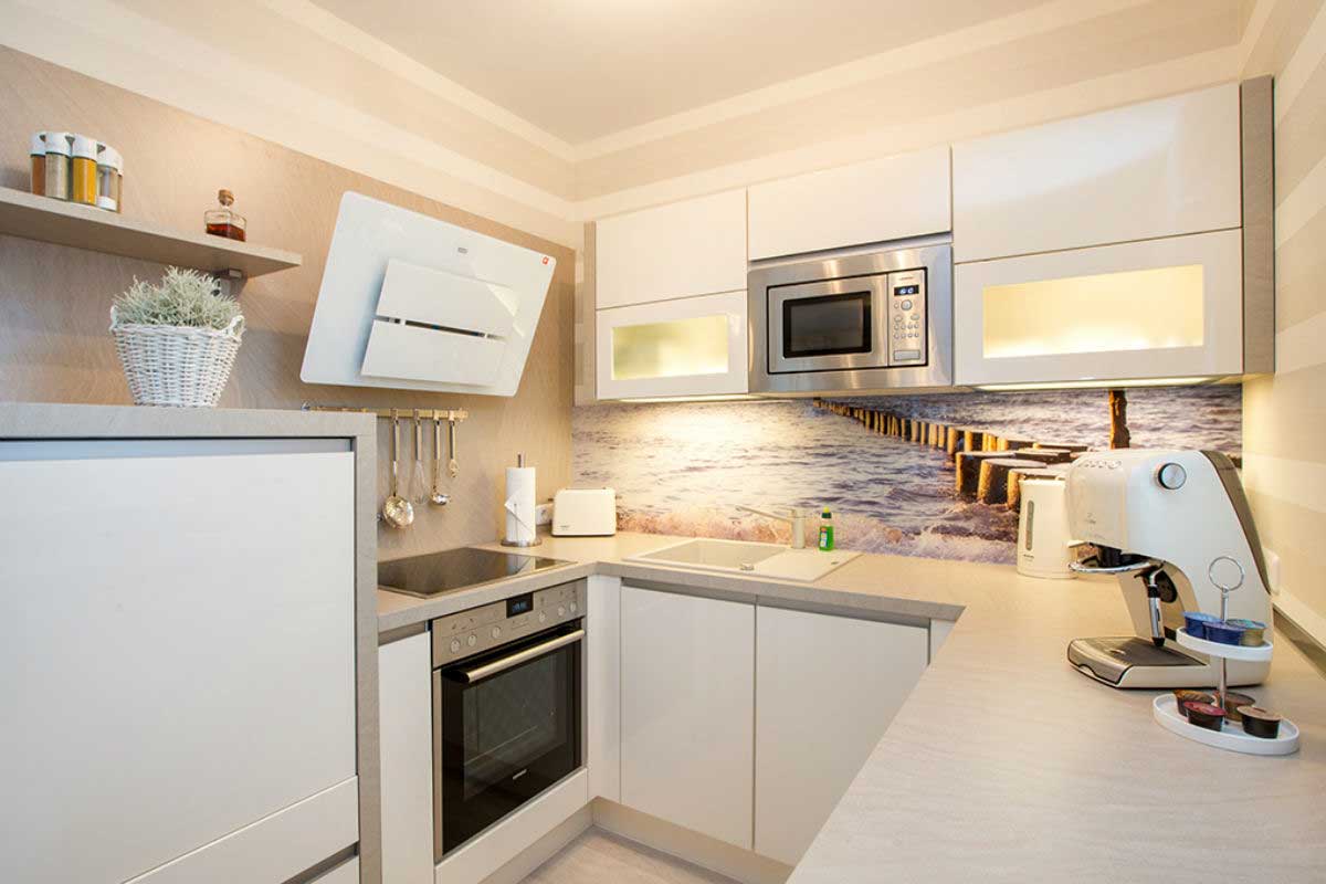 - Voll ausgestattete Küche, u. a. mit Geschirrspüler, Backofen, Mikrowelle, Kaffeeautomat, Wasserkocher, Toaster etc.